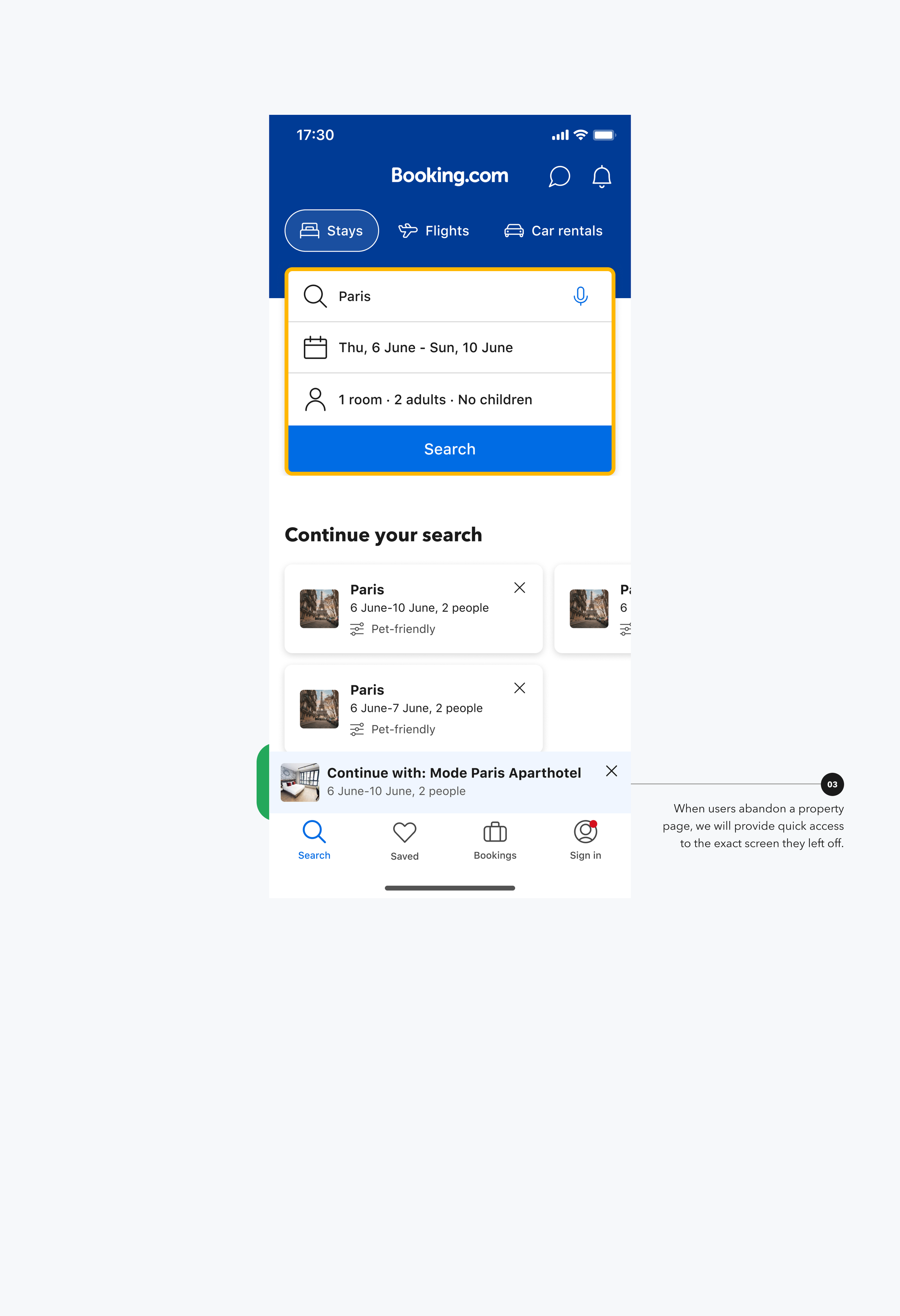When users enter the booking flow and drop off, there is no clear way to return to the same property and step they left off.